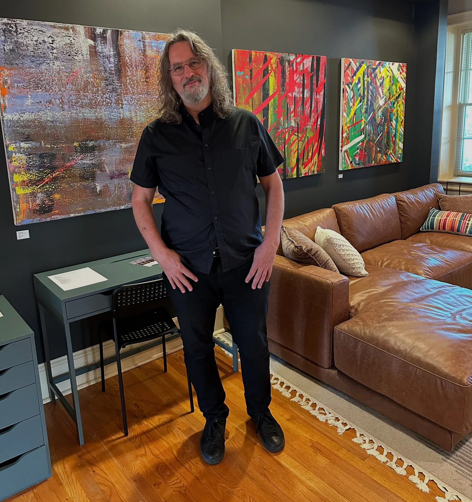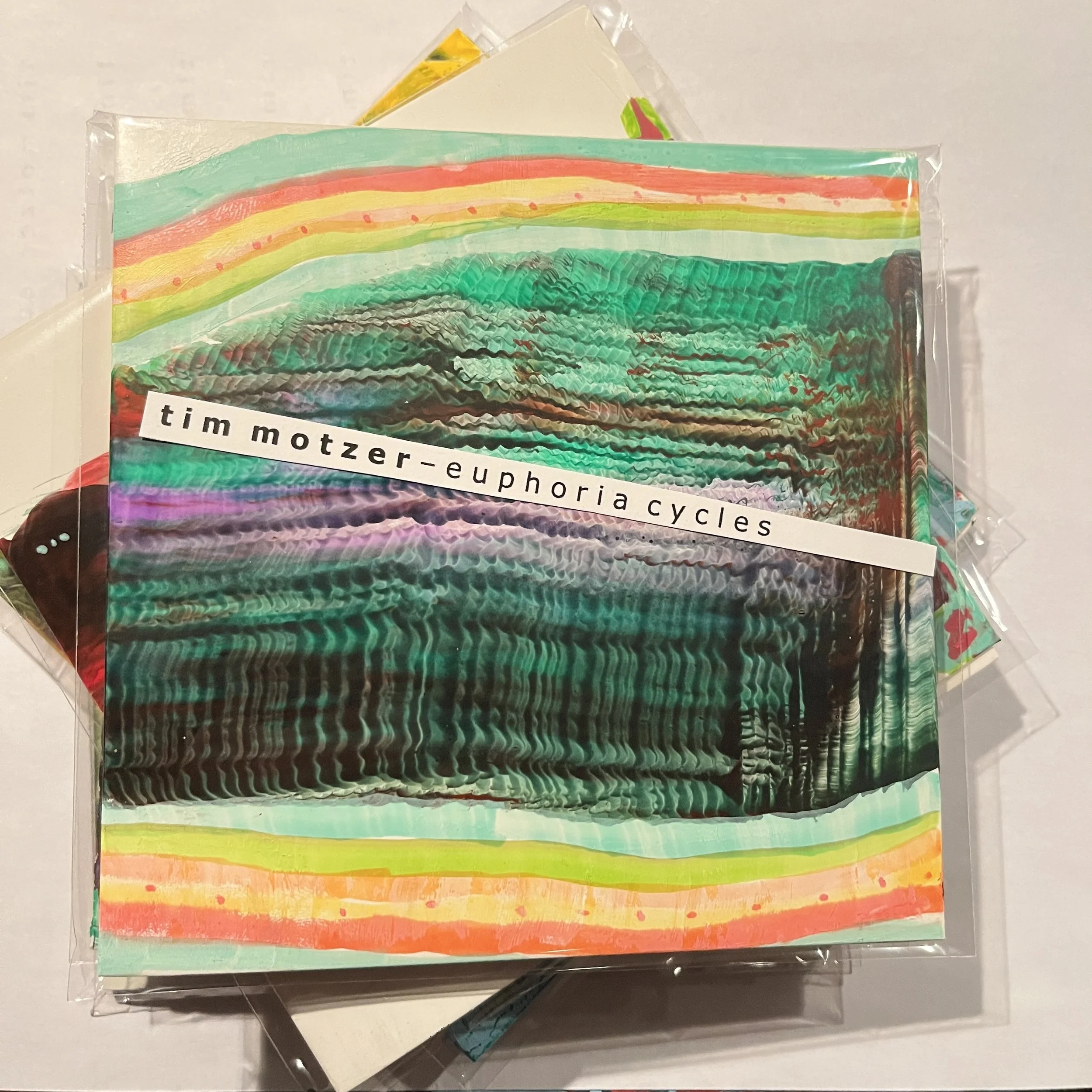 Motzer is currently painting large scale abstract works 40in x 40in, 48in x 48in, and 60in x 48in with acrylic and graphite on canvas; in a variety of sizes on paper; and hand-painted CD covers.